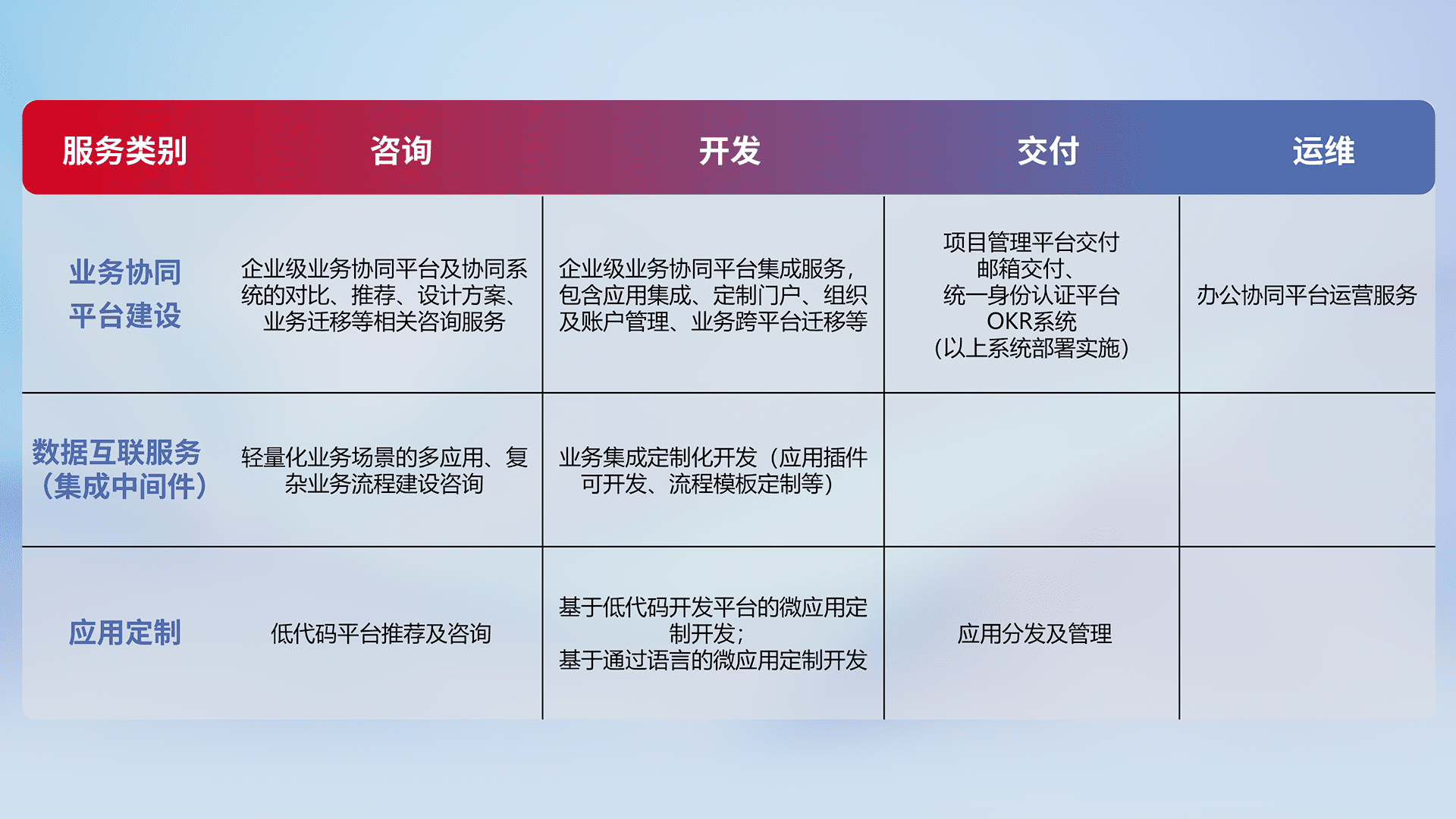 针对钉钉、、、企微、、IDaas等平台级产品提供产品的规划、、方案、、交付、、、定制化开发等服务,,,,实现如统一协同办公、、、、智能客户服务、、混合会议管理、、、智能数据查询、、、等业务场景,,实现数字化转型。。。