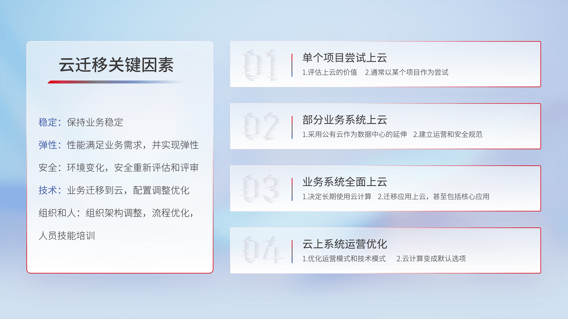 结合实际业务,,,从规划设计、、、云平台选型、、、云原生改造、、、数据迁移、、、集成交付,,,,迁移全过程为客户识别最佳上云路径,,,,做好风险识别管理,,,,设计网络架构、、、身份权限、、、安全审计合规、、操作审计、、、日志审计、、监控告警策略、、多站点容灾设计等,,,,对云上基础设施进行整体规划,,提升IT治理水平,,,以满足弹性、、高可用、、、高性能的需求。。