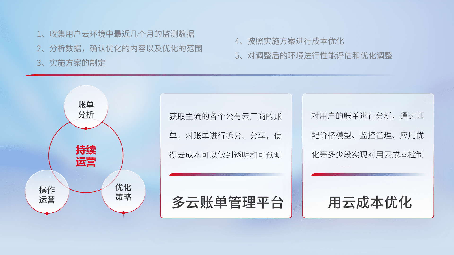 通过多云纳管,,,以统一的资源数据模型把客户的云资源进行抽象和封装,,,,进而实现对多云资源的统一操作,,保障云资源管理的可靠性、、稳定性与可用性。。。。量身定制化运维内容,,,配置、、、开发运维、、补丁管理、、、备份、、监控、、、认证和访问管理、、审计和日常巡检等,,保障在用云过程中的可靠度,,,稳定度以及高可用率。。。