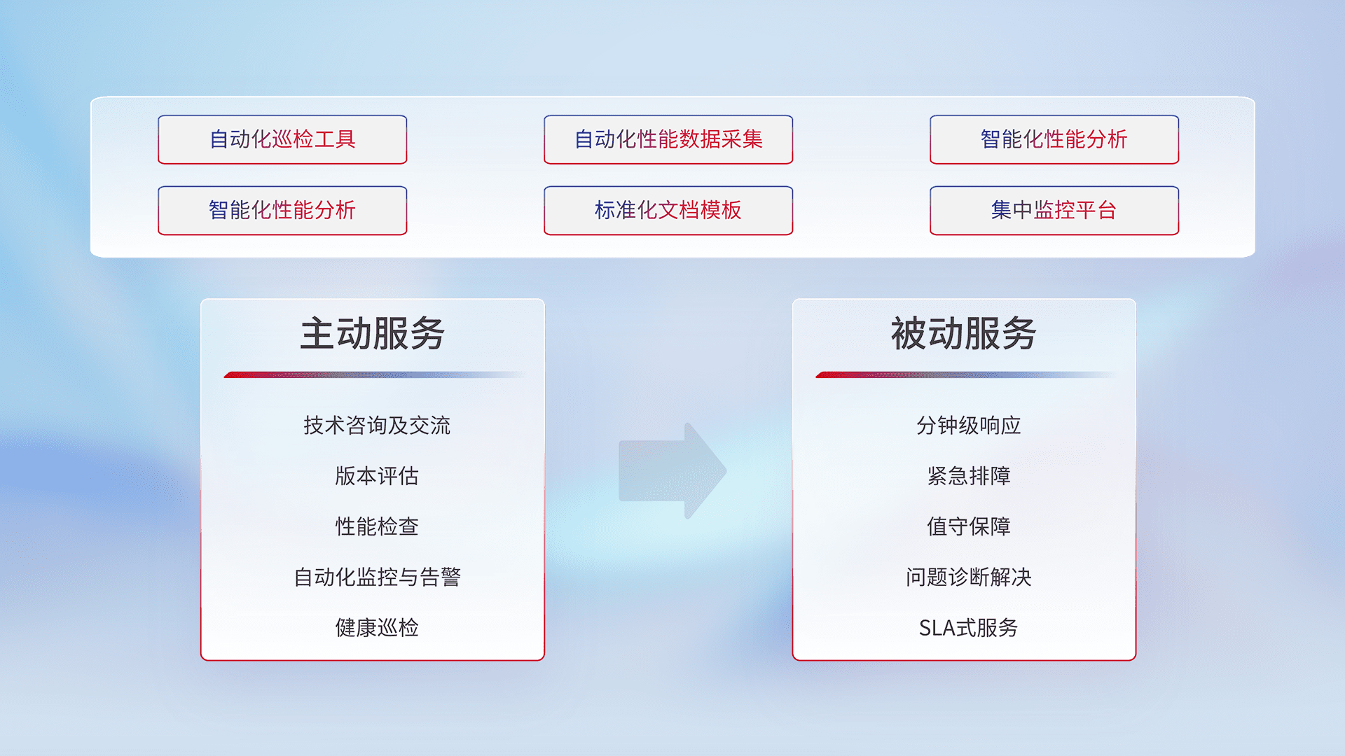 智能化工具和标准化文档,,保障服务质量,,,,提供主动服务(包含技术咨询、、版本评估、、、、性能检查、、、、自动化监控与告警、、健康巡检)和被动服务包含(分钟级响应、、、、紧急排障、、值守保障、、问题诊断解决、、、SLA服务)。。。。