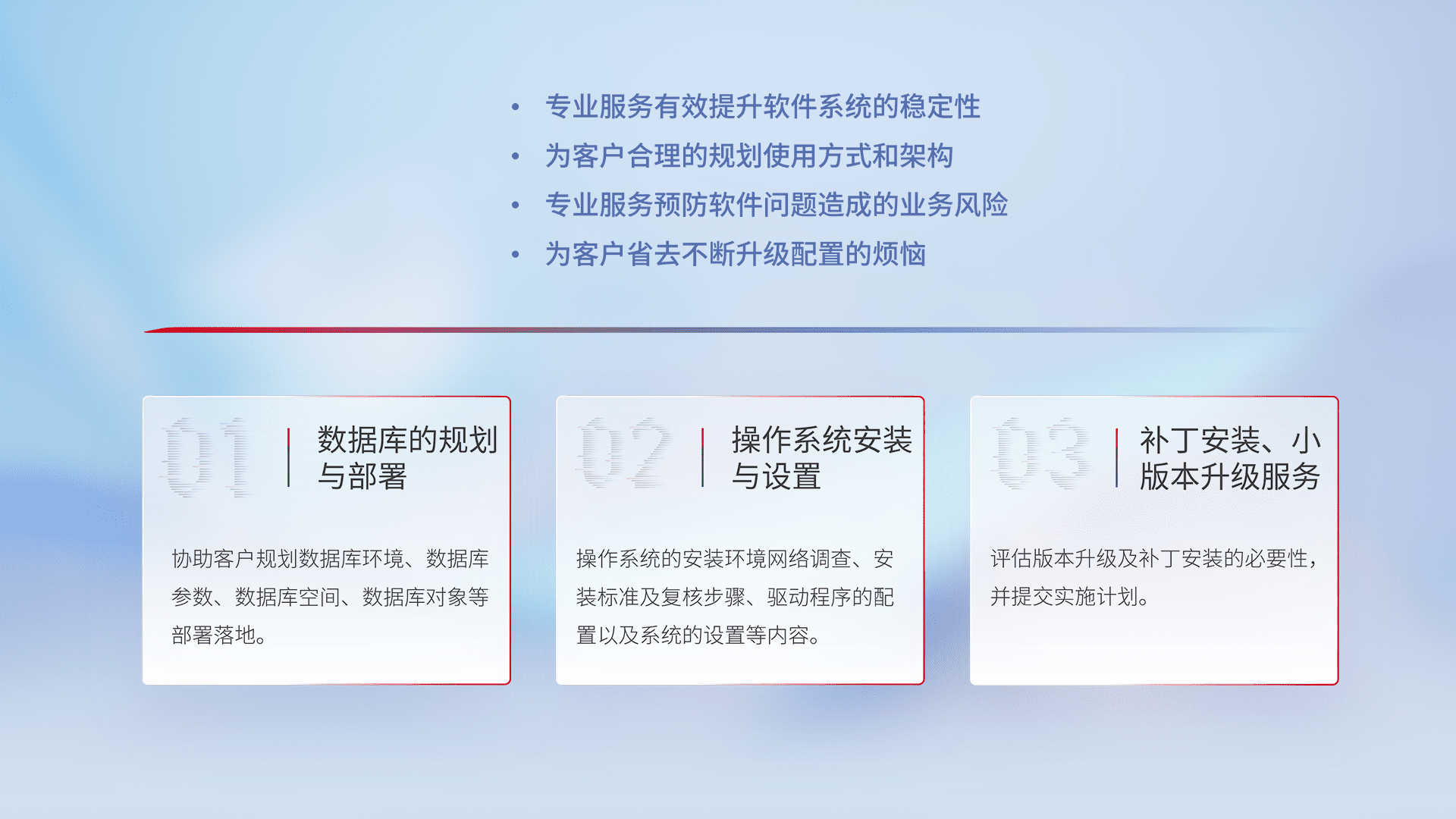 为客户提供软件规模升级、、、快速部署、、按需配置的专业服务,,,,从数据库的规划与部署到操作系统的安装与设置,,再到补丁安装和小版本升级提供支持。。。